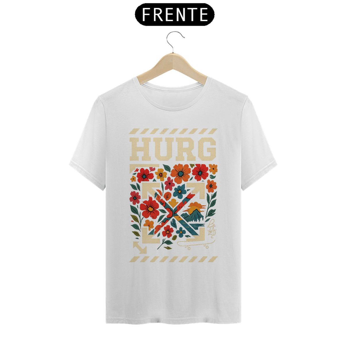 Estilo urbano com alma botânica. A camiseta HURG FLORAL STRIKE une o peso da streetwear com a leveza das flores — uma fusão ousada entre o concreto e o orgânico. A icônica seta da marca é tomada por um jardim vibrante em tons vivos, criando contraste com o fundo preto. Detalhes gráficos como faixas industriais e o esboço de um skatista completam a estética que homenageia o caos criativo das ruas.